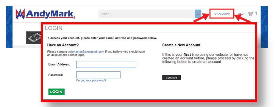 1. Login. Click the link to “My Account” at the top right of the AndyMark webpage to login to your existing AndyMark account or create a new account. If you’ve already successfully used the PDV on a previous order, the PDV will automatically be applied to orders placed with the same account.